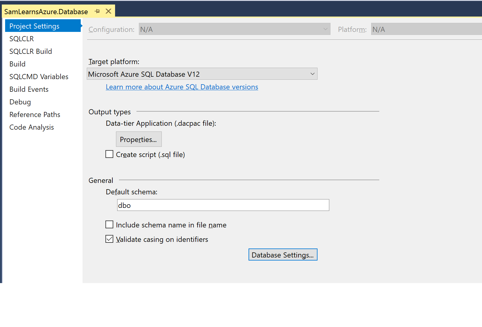 In the project properties of our new project, we change the database version from “SQL 2016”, to “Microsoft Azure SQL Database V12”, this is the version we are using inside of Azure. In the build tab, we also upgrade the .Net Framework version to 4.7- yes, this is a .NET Framework project, which we will need to work through when we get to the YAML build.