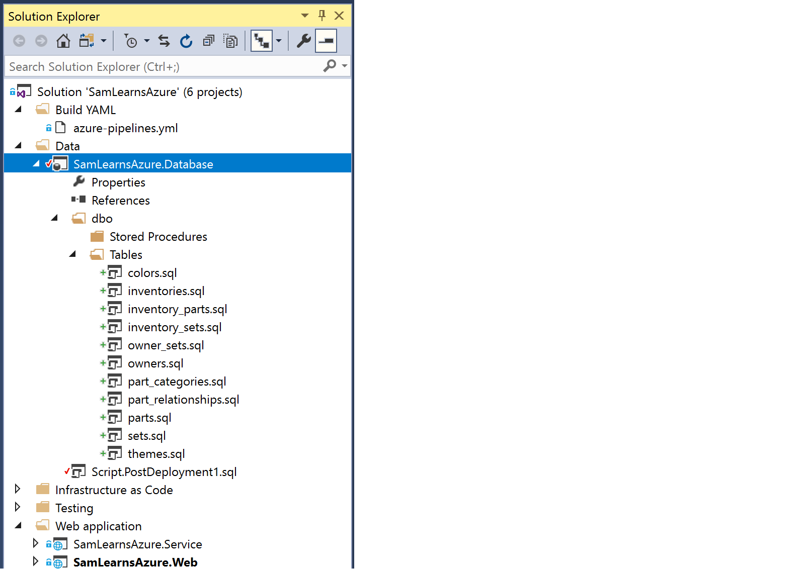 Most systems typically require some sort of input, interaction, and then output, workflow. Today we are going to setup our SQL database, add in some data, setup database DevOps, and round it off by writing some automated tests to confirm it all works. As we are creating the database in Visual Studio, Azure DevOps helps us to manage the database objects in source control, allowing us to track history, approve changes, and manage our database closer than in the past. This is a big change in thinking if you haven’t done this before, as you need to ensure that every change is repeatable. For example, an insert statement to add data to a lookup table needs to confirm that it hasn’t already run, or run a delete first to ensure that we don’t try to add the same data twice (and spawn a primary key violation).
