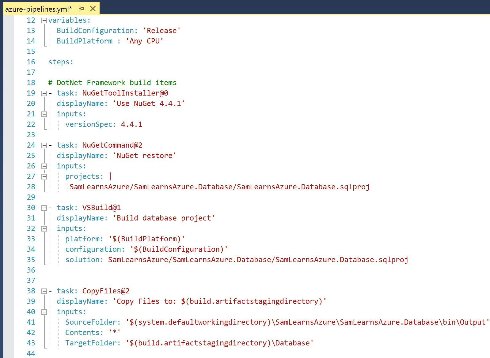 Now we can add to our YAML to build our database project to a DACPAC file. A DACPAC file is a record of the schema of the database, and any scripts that are run as part of it – this is the equivalent of right clicking on the project and publishing the database. There is no data in a DACPAC file, so they are typically pretty small, if we do need data we will use a BACPAC file – which we will talk about later. For now there are four parts of our database build, which are based on the .Net Framework. This requires separate steps from the .Net Core build tasks.