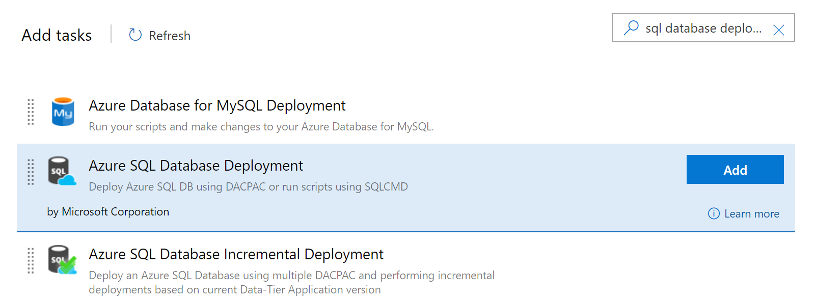 Now we are ready to deploy the database to each of our environments. We start by adding an “Azure SQL Database Deployment” task to each environment in the release.