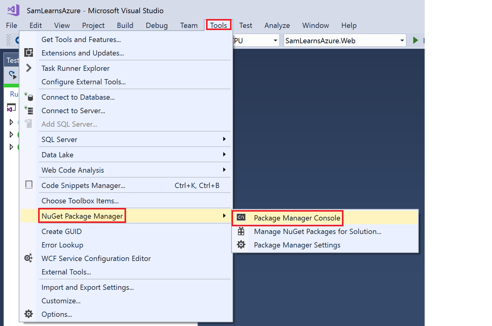 Next we browse to this menu item in Visual Studio: Tools> NuGet Package Manager> Package Manager Console