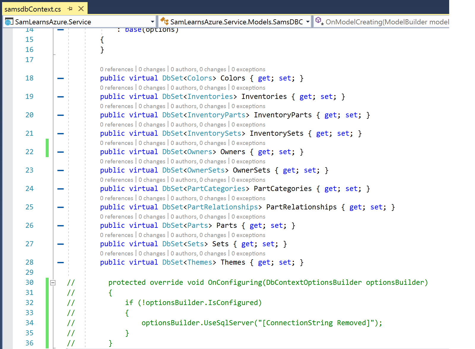 We immediately rename to “SamsDBContext.cs”, to meet our coding statndards. In the code, it has embedded the connection string we used to generate it, so we browse to that (lines 30 to 36 in our screenshot), and delete the connection string. We actually don’t need the “OnConfiguring” function, so we comment out the entire function, as shown below. We are going to move this commented functionality into “startup.cs” later.