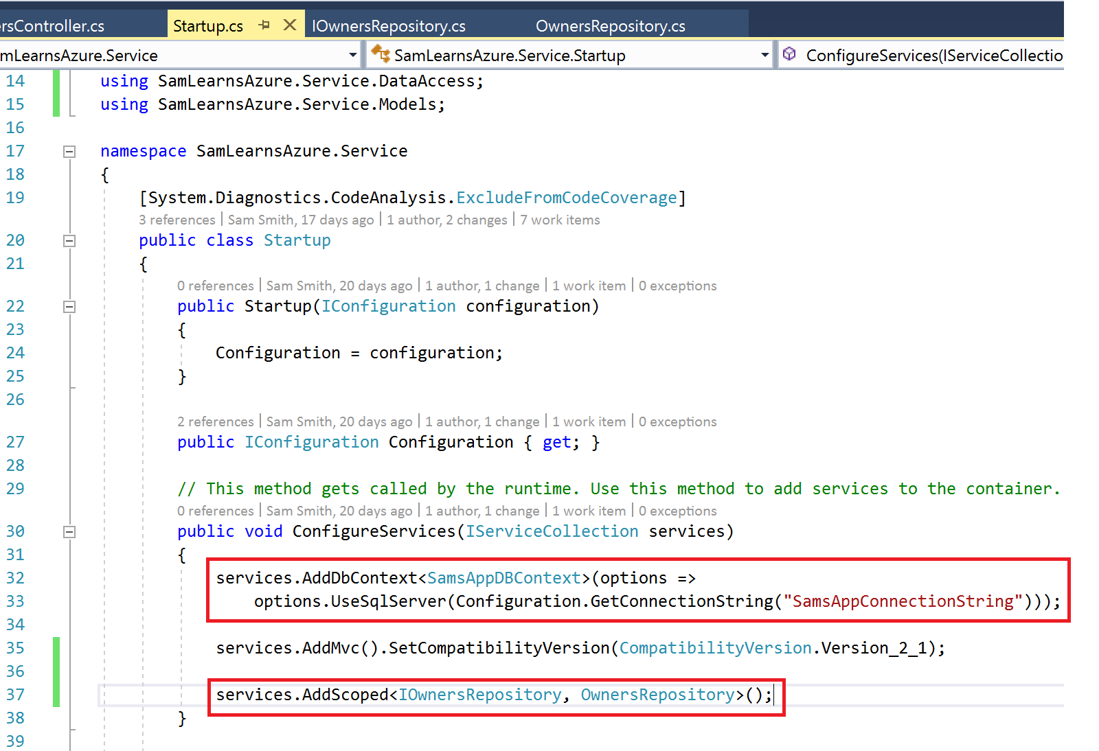 In out web service “Startup.cs” file, we add a configuration line to set the connection string for the “SamsDBContext” file using the configuration populated earlier by Azure Key Vault. This is the replacement code to “OnConfiguring” we deleted from our “SamsDBContext” earlier.