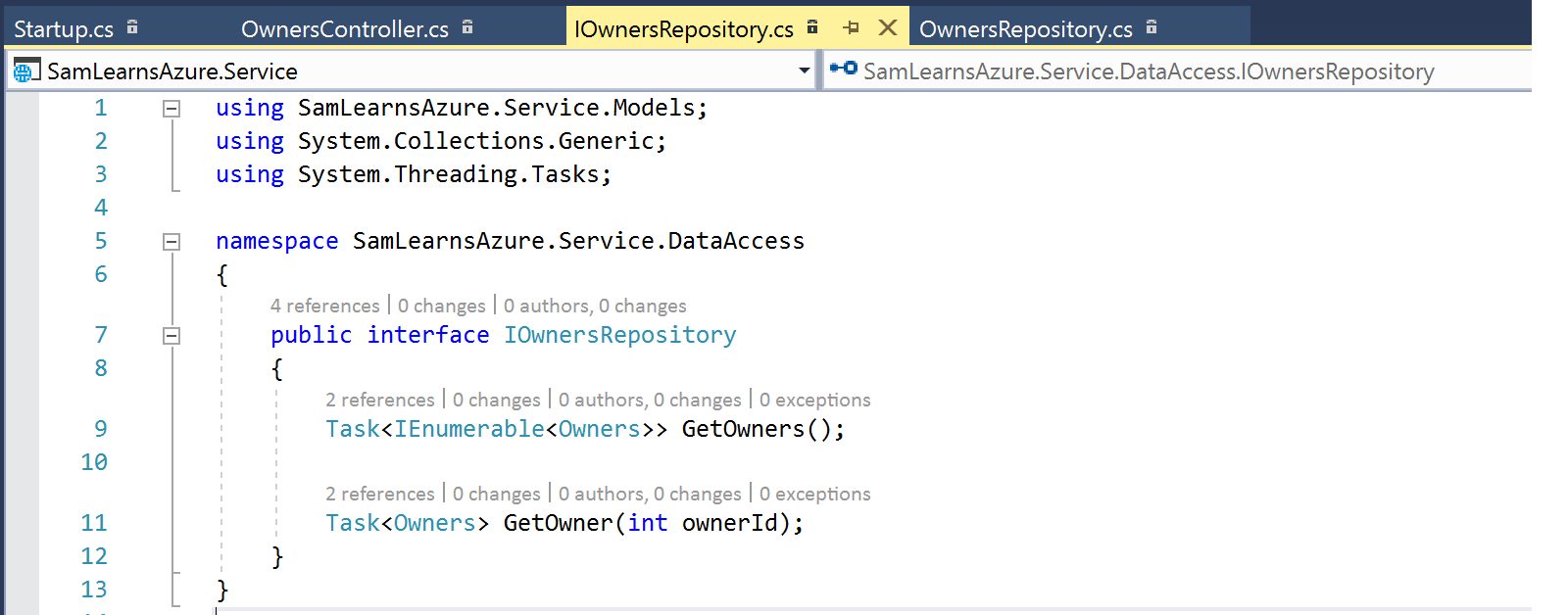 Next we need to add repositories, with matching interfaces we inherit from to enable DI. Let’s review a simple version, for owners. The interface is straight forward, showing two functions, one to get a list of all owners, the other to get just one owner with an “ownerid” identity.