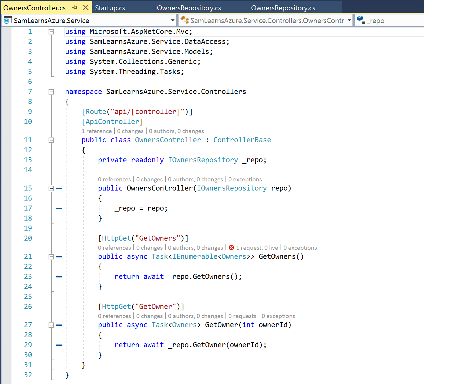 We initialize dependency injection on the Owners repository, we need the following code – this creates a reference to Owners that will be available for our requests.
