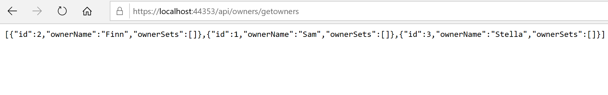 That is all we need. When we run the service and browse to the api/owners/getowners path, we see the following result, confirming that our database is being successfully called: