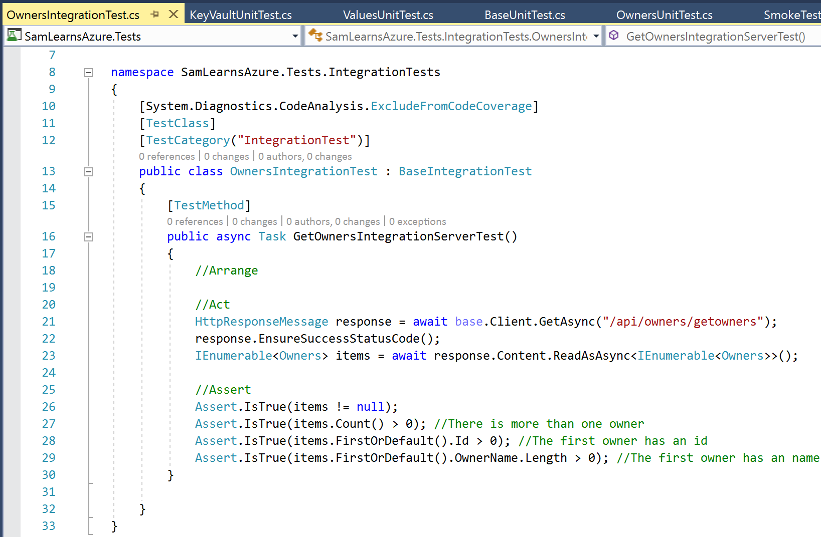 For the integration test, we inherit from the “BaseIntegrationTest” class we wrote earlier, following the same pattern we used in our testing post to call get owners and process the data. Our asserts are still very simple at this stage – we are really just verifying that some data – any date is being returned. We think it’s better to take this approach early on – it’s tempting to write integration tests that check real data, for example, “Owner 1 is Sam”. The problem is that over time, data changes, and you will find that tests will often fail and distract you – if you are busy, suddenly you’ll have 50 or 100 tests that are failing, which will overwhelm you, and suddenly we aren’t practicing Agile anymore. This is really common, but you can prevent it, by working smart now, rather than hard later.