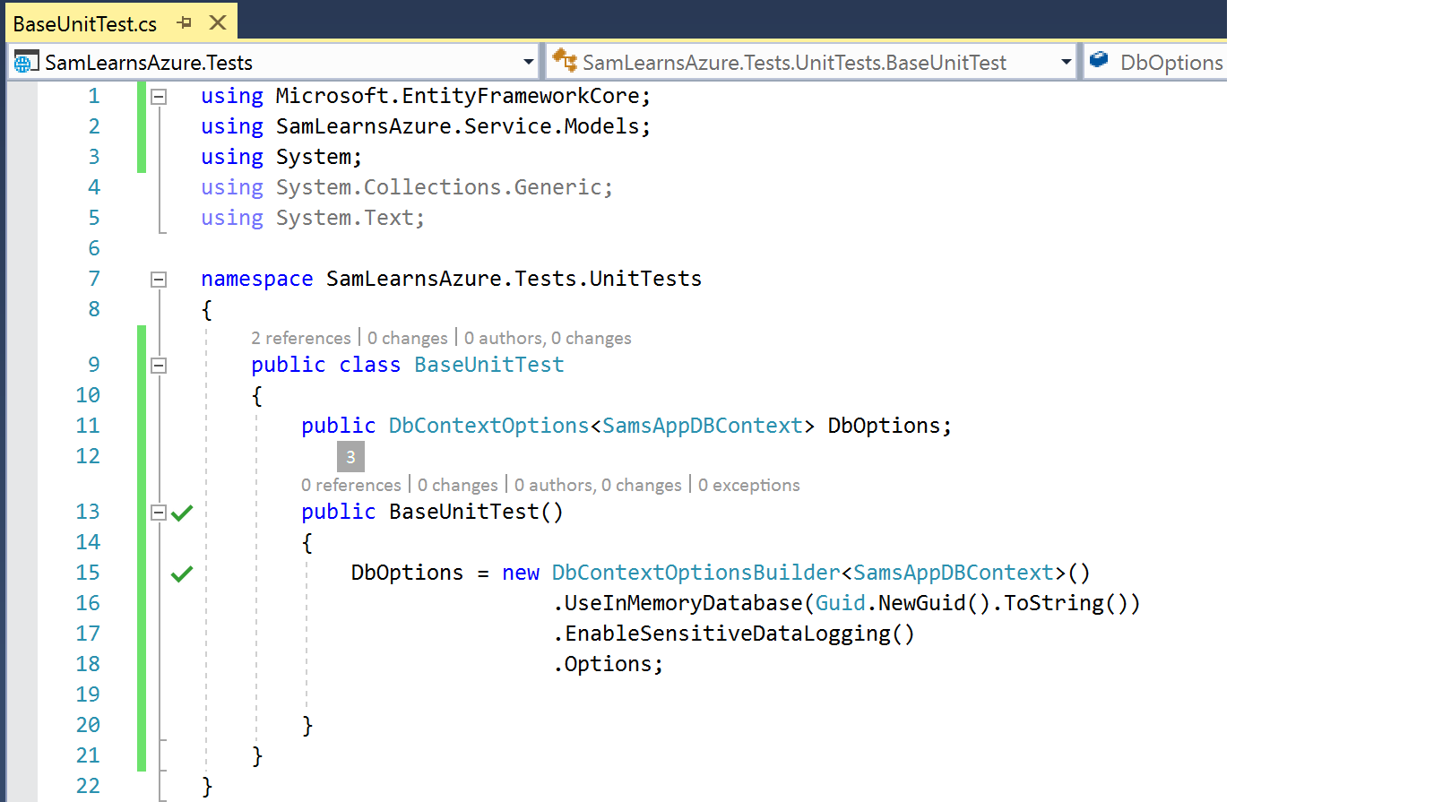 With this result, we turn to our tests. Starting with our Unit Tests, we need to write a class to initialize all of our unit tests that hit the SamsAppDBContext.