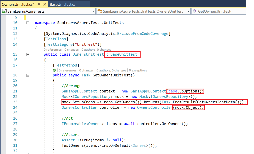 In our actual Unit Test, you can see the class is inheriting the “BaseUnitTest” to initialize the “DBOptions” variable. Then we use Mock on our “IOwnersRepository”, and then on line 23 is the hard stuff. We setup the mock to call GetOwners() in the repository, but return our “OwnersTestData” instead of going to the database. Note that we pass the “mock.Object” to the controller – which it uses to return our test data, rather than data from the database. We run the test and note that it runs in 7ms. That is not a typo – that is nice and fast.