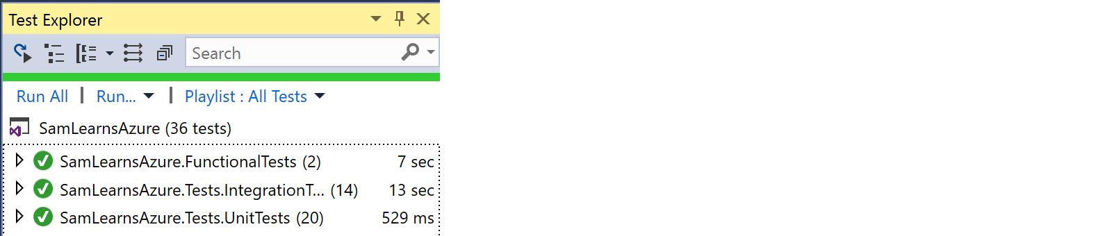 We flesh out the rest of the integration and unit tests to cover as much code as possible. We need to add some more smoke tests, but we will do this later. We commit our code and complete the pull request when it’s successful. Not that our 20 unit tests are running in about half a second, where as our 14 integration tests need nearly 15 seconds. This is the test pyramid at work again.