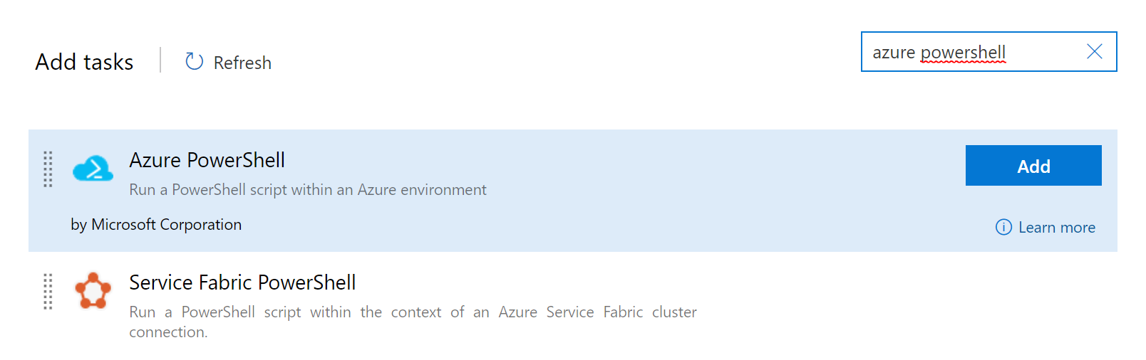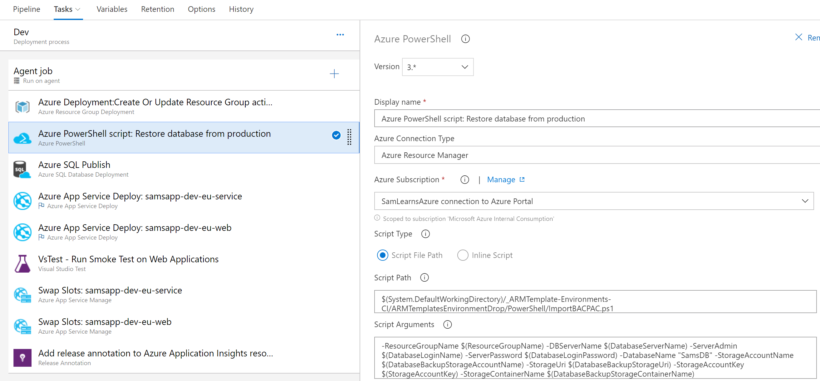 Instead, we will use a custom PowerShell script we wrote, and load the database with a couple tasks. In each of our environments we need to add the “Azure PowerShell” task.