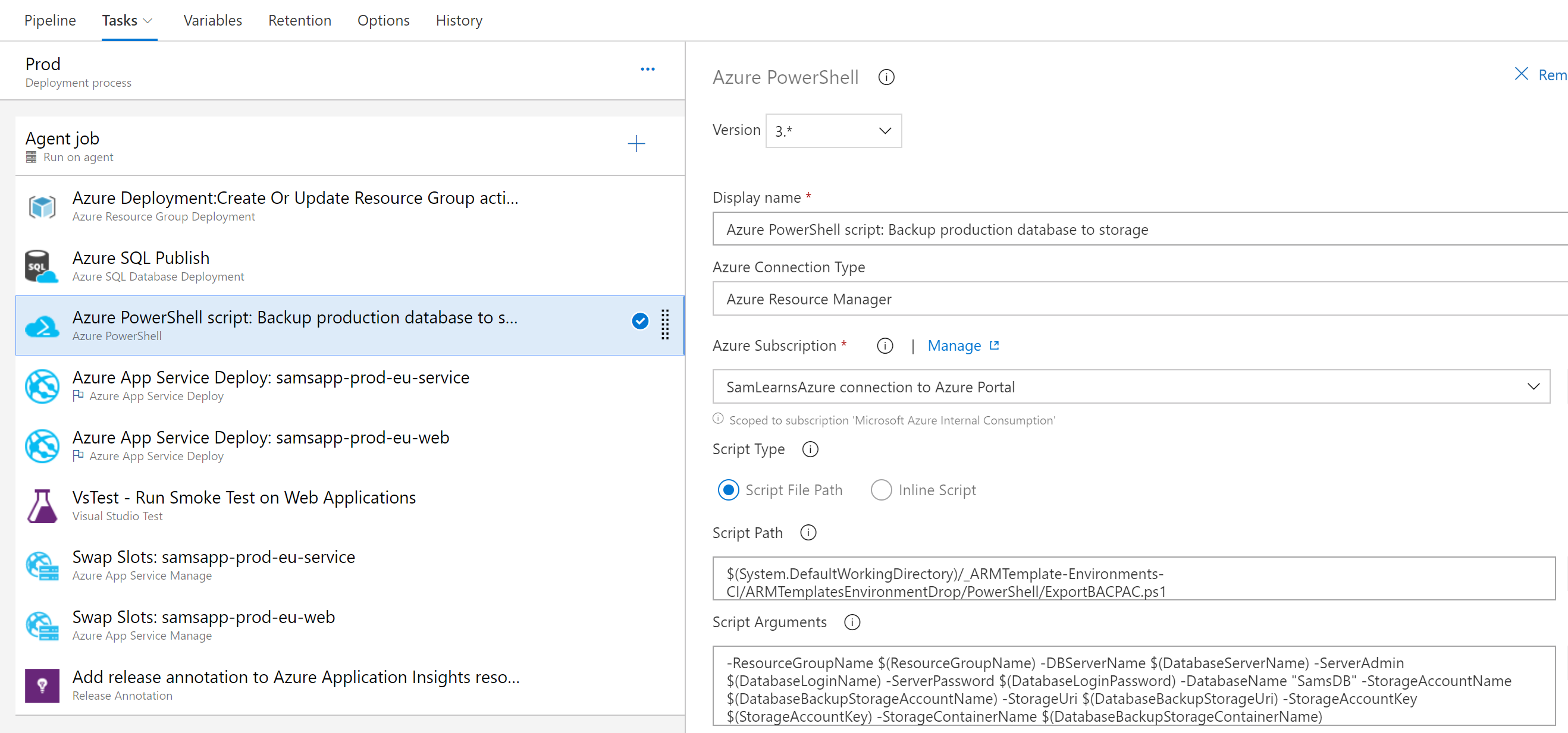 Similar to the import task, we implement the export PowerShell in Azure DevOps, specifying the subscription, and then pass in the information we need to connect to the storage (we are using the production storage, but any will work – note that the storage key will be in Key Vault, but the other variables will be regular Pipeline Variables), and then the Production database details we are exporting from. Note the position of the PowerShell task, right after the database publish, so that we backup the latest version of the database.
