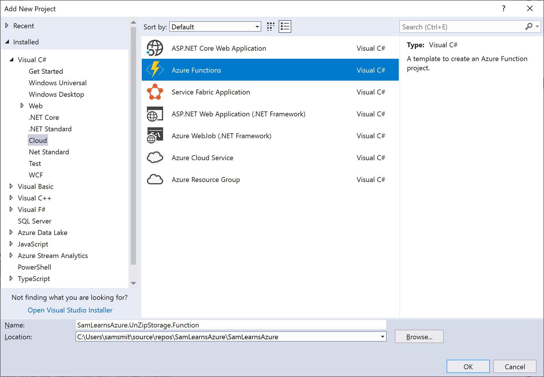 Attempt #3: The next approach will use Azure Functions, unzipping files into Azure Data Storage. There are a number of advantages in using a function here. As there are millions of images to unzip, processing the content in the cloud will allow us to scale and process the data in parallel. This parallel processing will enable us to complete the workload in seconds, rather than hours – as we could have an instance of the function run for each zip. The plan here is to have the console app still upload the zip files, and then trigger a HTTP trigger for each file. We start by right clicking on our solution to add a new project, selecting the “Azure Functions” template, and naming the project “SamLearnsAzure.DataMigration.Function”.