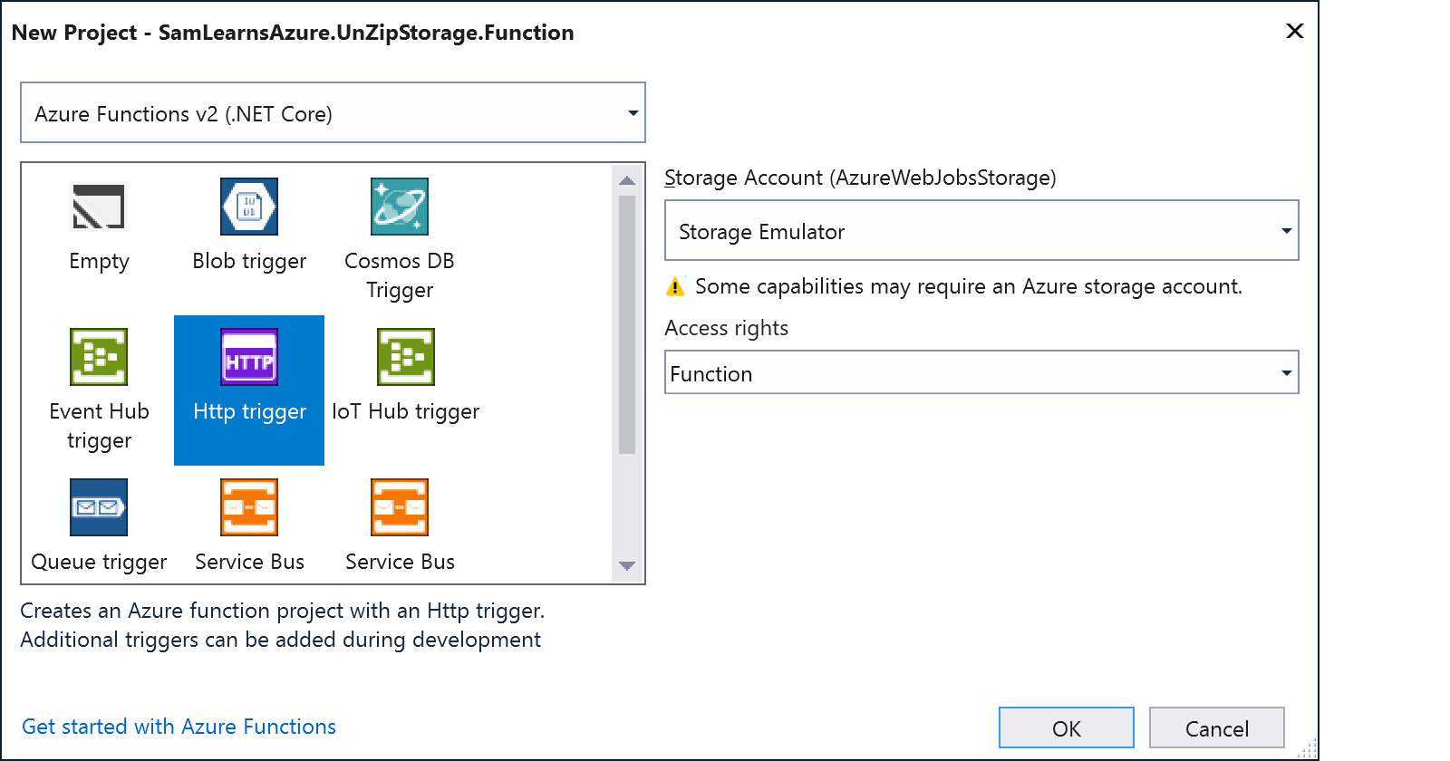 We then select “Azure Functions v2 (.NET Core)” to use the .NET core version, “Http Trigger”, to create an HTTP trigger, and leave the other options as they stand.
