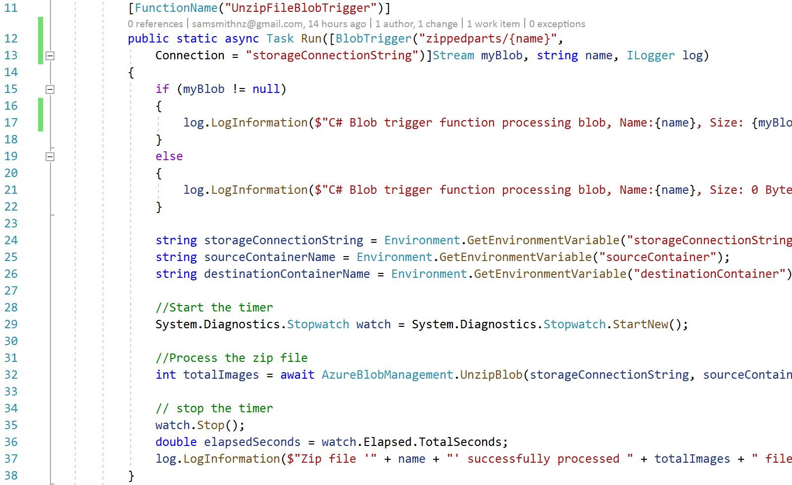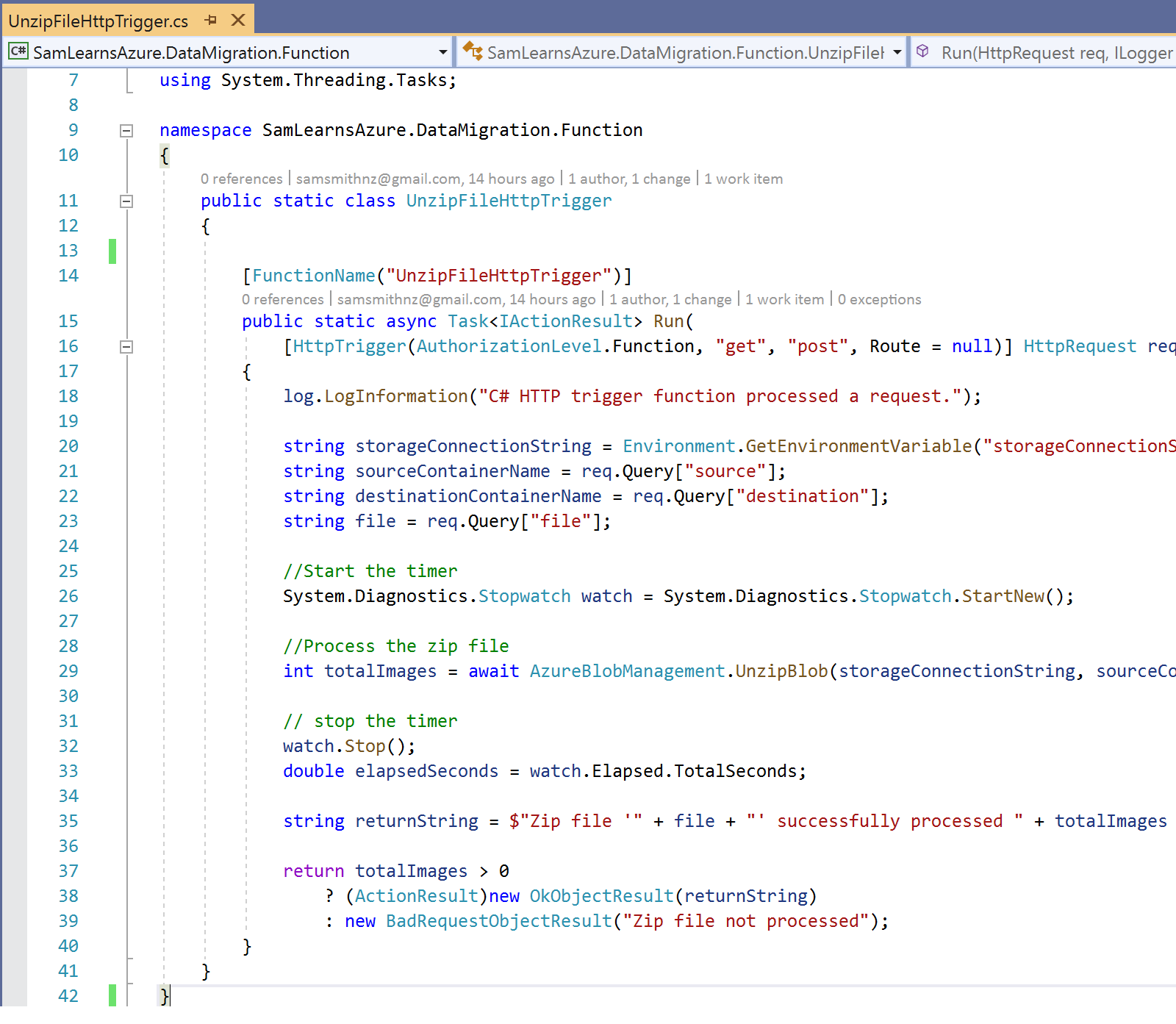 UnzipFileHttpTrigger?source=&destination=[destination container name]&file=[file to unzip]”. You can see these query string items being extracted on lines 20 to 23 below. On line 26 we start a timer to add some more information to our log. On line 29 we unzip the blob using the code we created on our previous attempt. We then stop the timer on line 32 and log and return the result.
