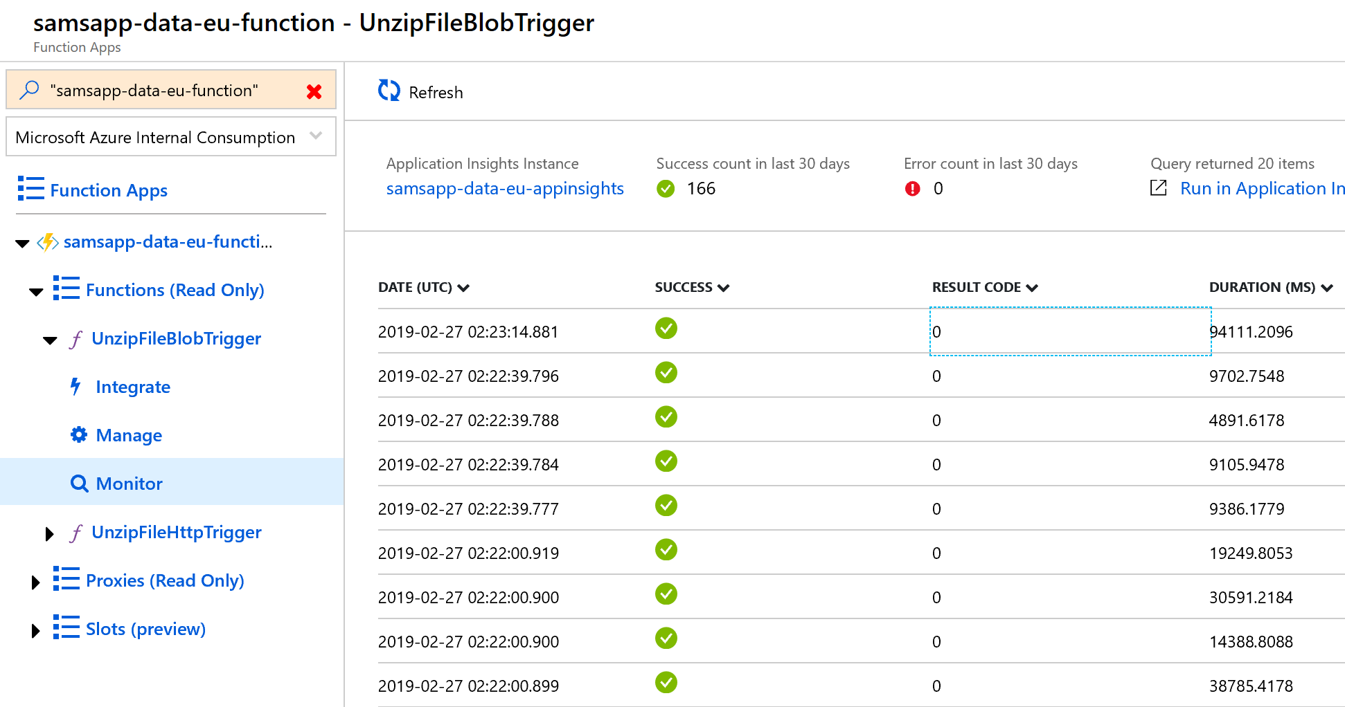 This works brilliantly, processing all of the zip files in 15 minutes – including the 8 minutes required to upload the 1.3GB from our connection. If we were running this more often, we might consider looking for more optimizations, perhaps using a queue and having the function download the file directly into the storage blob, but this is a very good result for us today.
