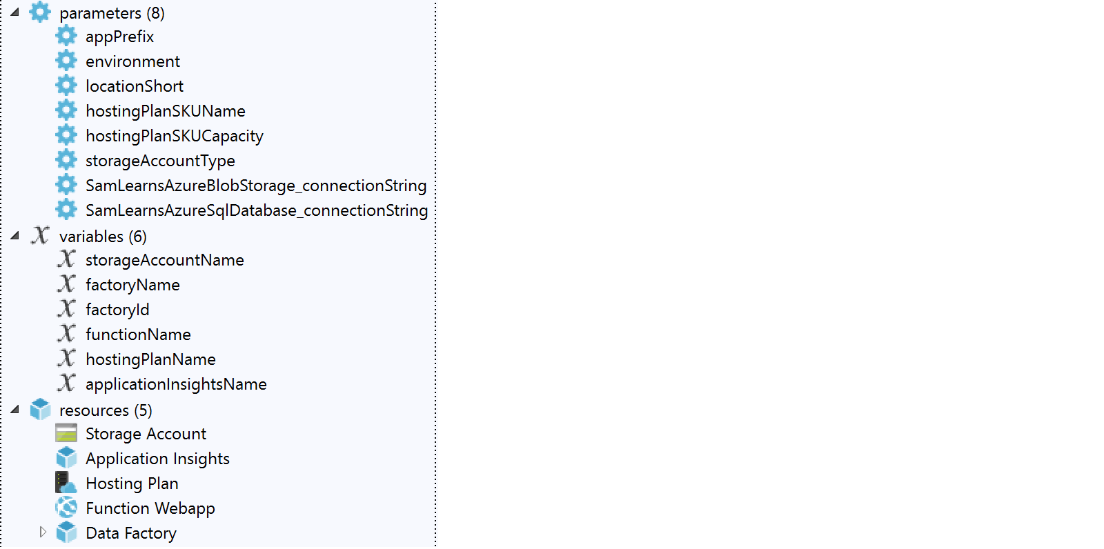 Using infrastructure as code with ARM templates, we need to deploy Azure Storage, our Azure Function with Application Insights, as well as our Azure Data Factory from our previous blog post. As we don’t need this for every environment, we are going to refactor our previous “SamLearnsAzureCore” resource group into a new “SamLearnsAzureData” resource group, to essentially put all of the data migration items in one resource group and prove that what we deploy in “data” matches what has already been created in “core”. We are creating a new ARM Template Visual Studio project for our data migration, and later we will create a separate DevOps pipeline for this, as it’s, (in theory), a one off task – although we may want to run it again if the source files update.