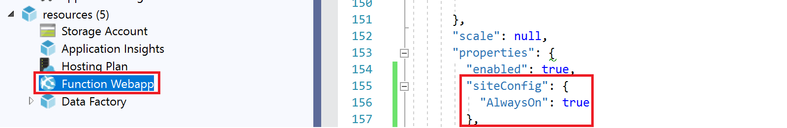 When deploying the functions, we noticed that “AlwaysOn” was not being enabled. This is recommended for functions. To correct this, we need to change the “siteConfig” setting, which is currently set to null.