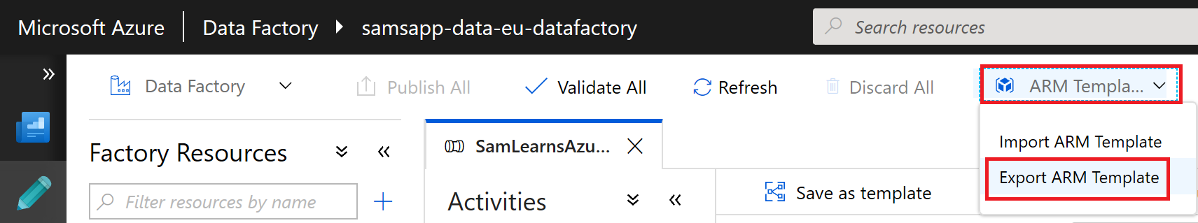 Configuring the ARM Template to deploy the data factory was more complex, to say the least. To export the data factory, you need to enter the data factory pipeline editor and click the ARM template menu to export it.