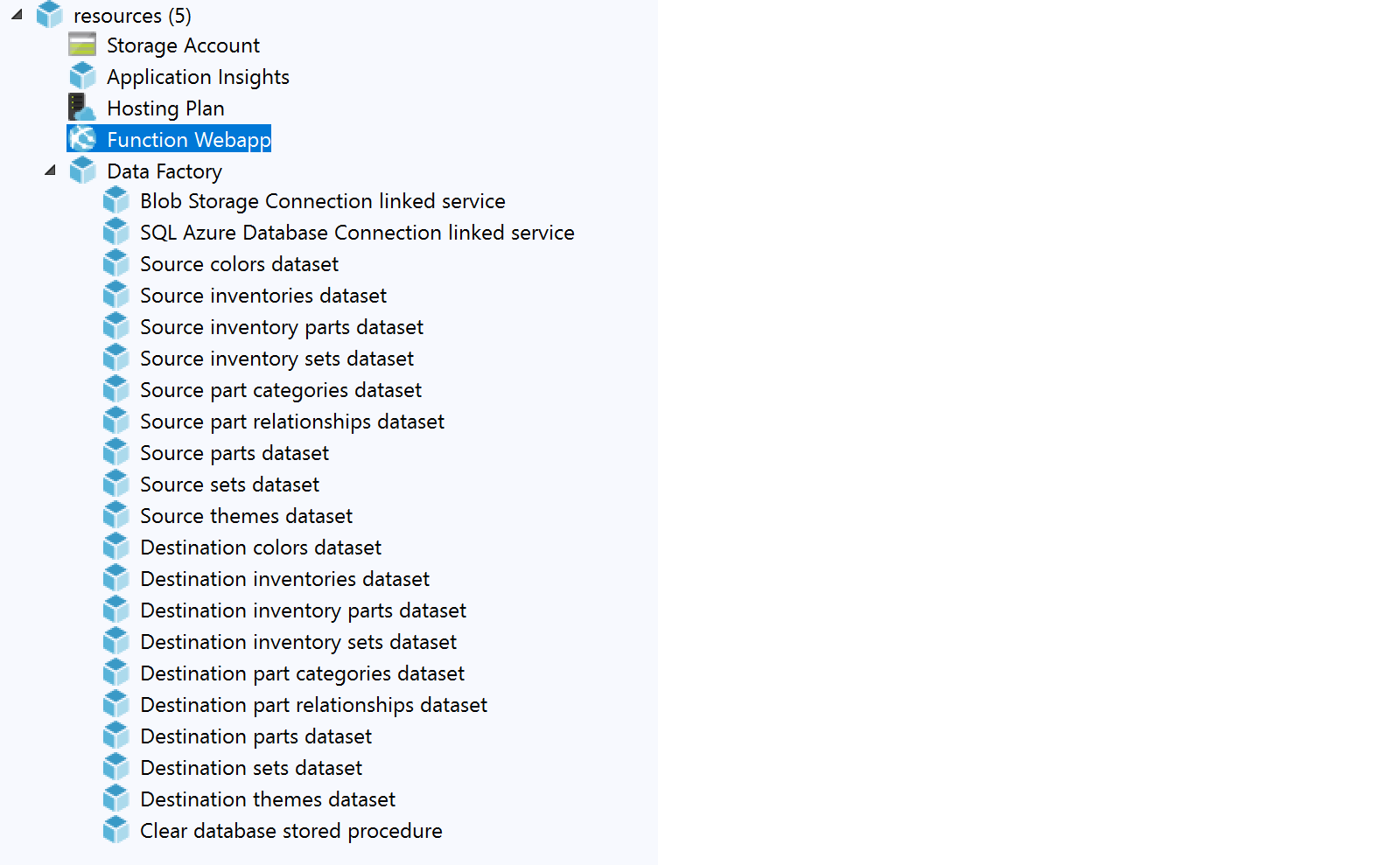 The actual exported ARM Template is a bit of a mess – it created many linked templates. The problem with a linked template is that you need to call it from a URI – either publicly or from a blob storage. While we did experiment with editing the build to deploy the ARM templates directly to the storage, it made development very difficult – as we couldn’t run and test the ARM template locally. Ultimately, we found a way to combine the Data Factory into a single ARM template allowing us to run and test locally, and also deploy without using Azure Storage.