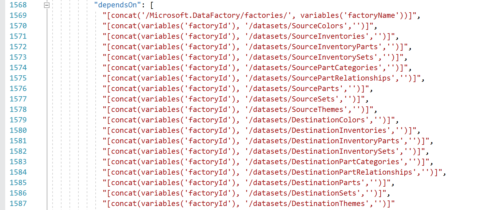 We do need to fairly aggressive with the “DependsOn” properties of our Data Factory children. Before we create our pipeline activities, we need to ensure our datasets have been created, and before we create our datasets, we need to ensure our SQL and storage connections have been created. As a result, the pipeline “dependson” ends up looking like this: