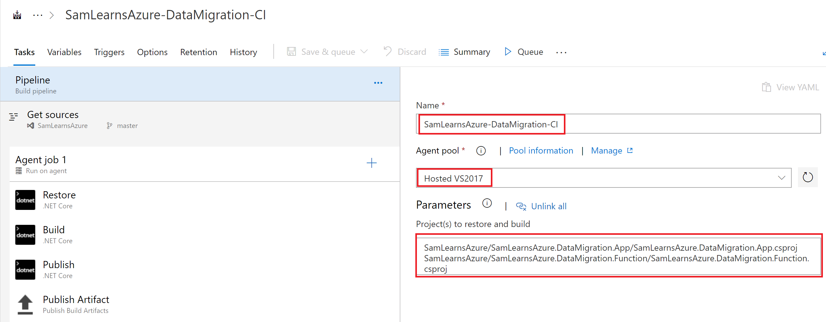 On the Azure Pipeline>build page, we click the new build button, use the visual designer, select the correct repo and branch, and then select the “ASP .NET Core” template. In the new build, we rename it to “SamLearnsAzure-DataMigration-CI”, set the Agent pool to “Hosted VS2017”, delete the “Test” task, and add the migration console app and Azure function projects we need to build. If any of this seems a bit confusing, refer to our old ARM Templates build.