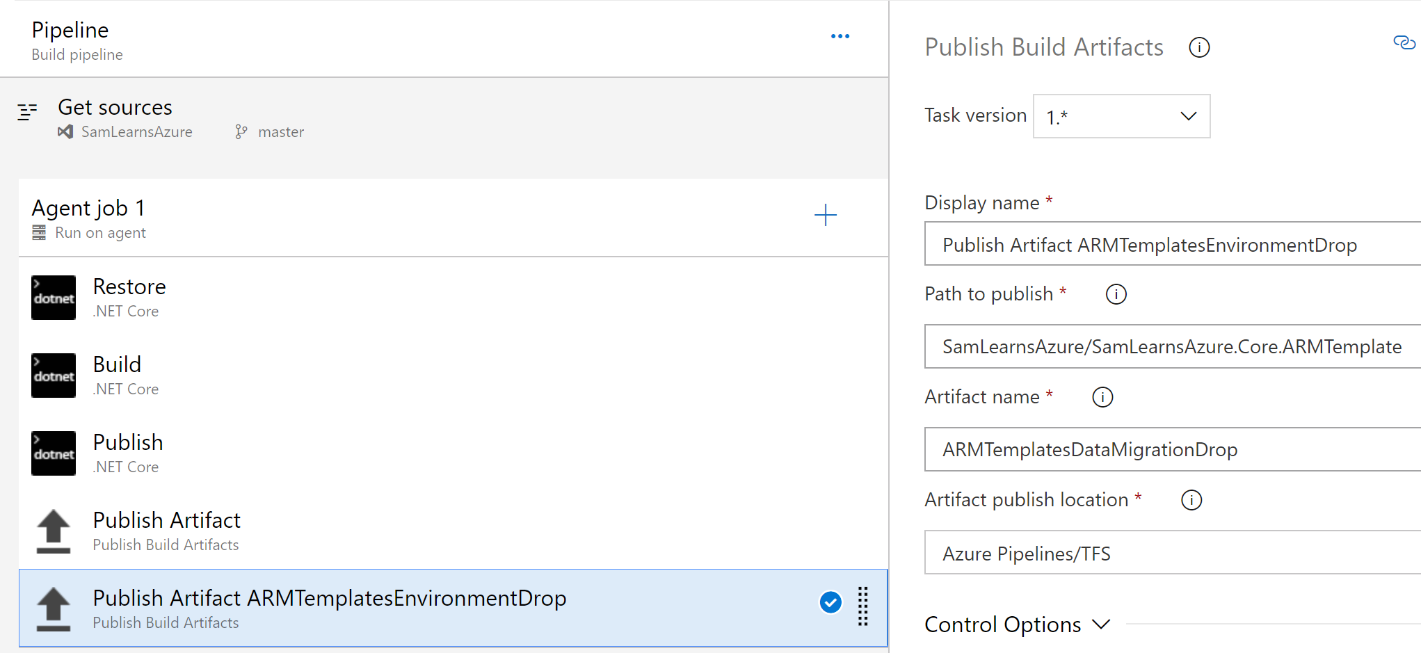 With the .NET core applications setup to build, we just need to add a second “Publish Build Artifact” task to copy the “Core.ArmTemplate” project files to a separate drop folder.