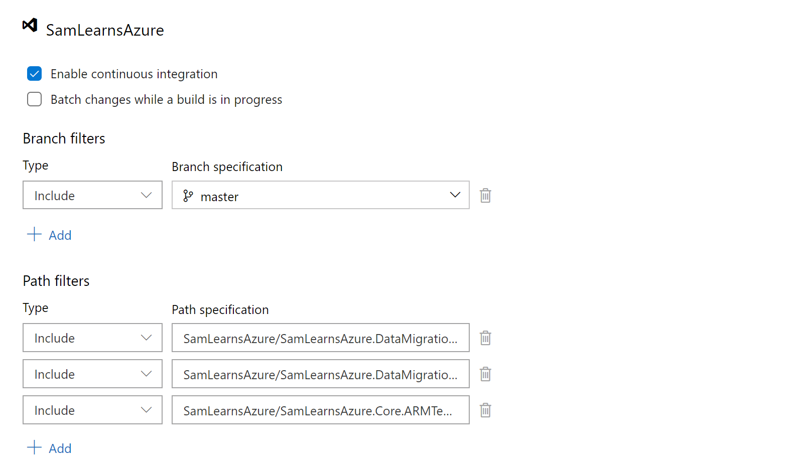 Finally set the triggers, enabling continuous integration, but specifying path filters, so that the build only runs when changes are made to the console app, function, or core ARM template.
