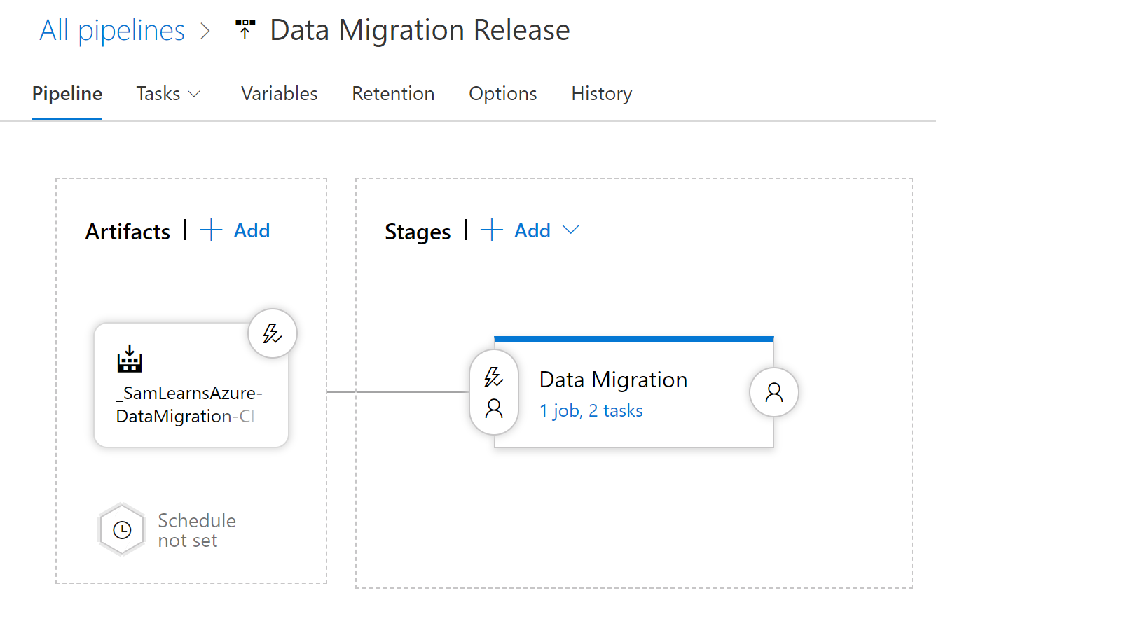 Next we need to create a new release. We start a new “empty” release, naming it “Data Migration Release”, and adding the “DataMigration-CI” build as an artifact, setting up continuous deployment, and renaming the environment to “Data Migration”.