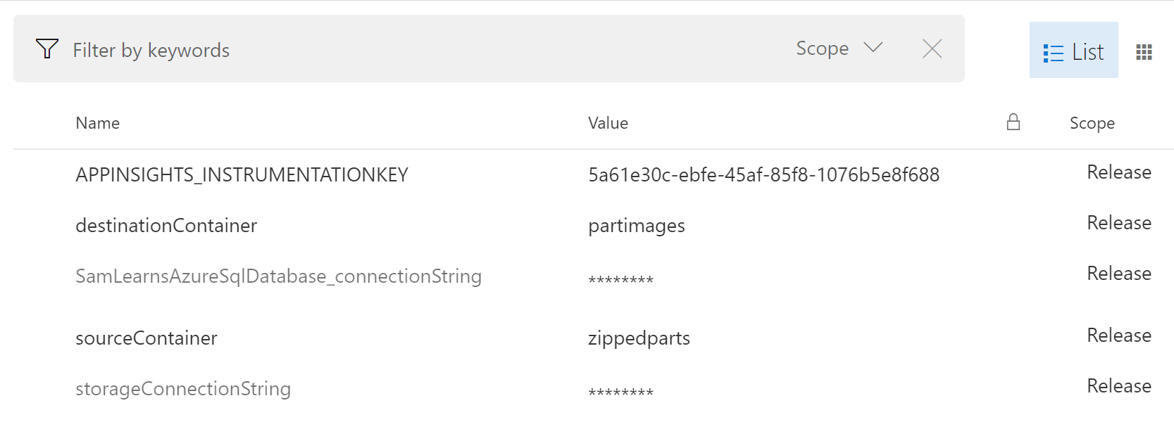 In the pipeline variables, we add six new vaiables, but as there is only one environment, the scope can stay as “release”. We add a variable for our Application Insights instrumentation key, and the destination and source container names from our Azure Storage for our Azure Function. We also add a SQL connection and Azure Storage connection, that we will pass to our Data Factory in the ARM template.