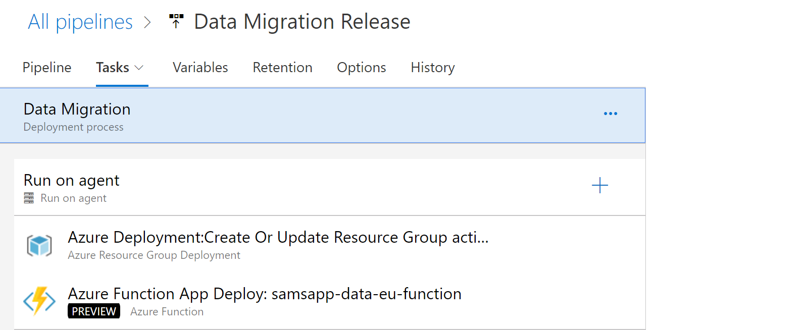 We need two tasks in our release, an “Azure Resource Group Deployment” task to deploy our ARM template, and a “Azure Function” task.