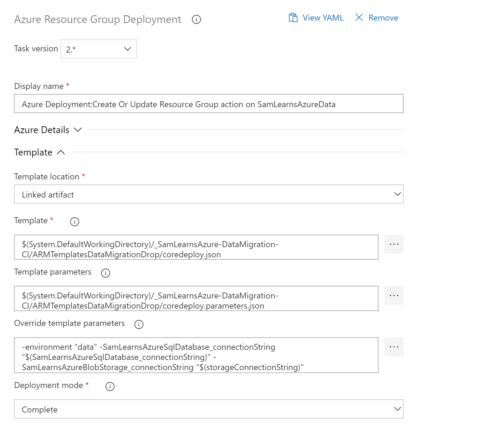 The ARM template deployment requires the basic subscription and resource group information. We then add the template and parameters file names, as well as the override parameters, using the environment name and passing in the SQL and Azure Storage connection strings. Finally we update the deployment mode to be “Complete”.