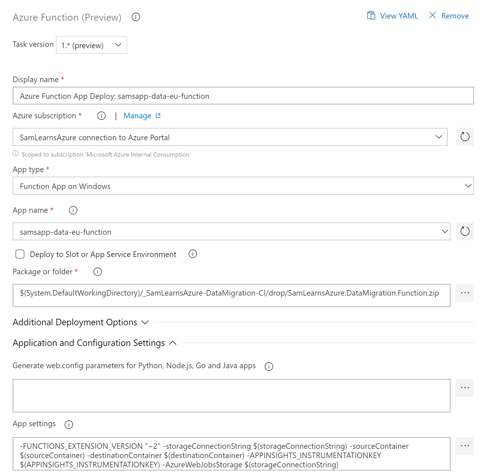 Configuring the deployment of the Azure Function turned out to require a bit more trial and error. After specifying the subscription and app name, we added the build zip file. In the “App settings” we needed to add some extra settings over the expected storage connection string, source container, destination container, and Application Insights instrumentation key. We also needed these next two items for our function to run. These don’t seem to be widely documented, but we noted they are added when you publish a function to Azure directly from Visual Studio: