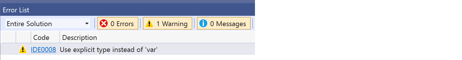 For example, the default style for explicit types in a new Visual Studio project is in the table below. What does this mean? “var” types can be used, and no (“none”) warning or error is shown.