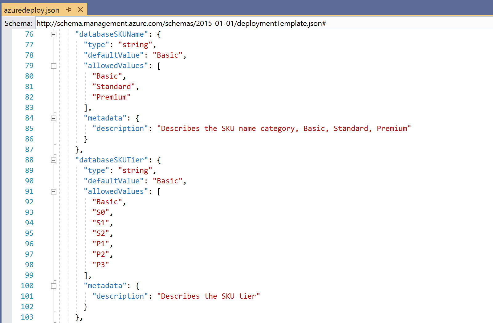As we are using infrastructure as code, we load up our project in Visual Studio project, create a branch, and get to work updating our database to the Basic edition. Initially, this looked to be as easy as adding a new entry for “Basic”, but as we dived into the details, we discovered there was a newer recommended method of defining the database edition.