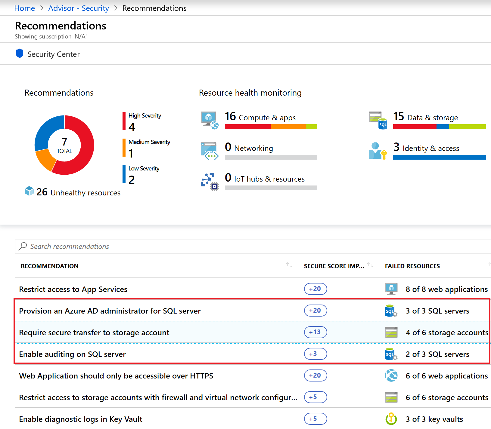Next we move to the details of the security advisor, there are 26 ‘unhealthy’ items. As we mentioned earlier, we are just going to focus on the Azure Storage and SQL Server items today, which we’ve highlighted red.