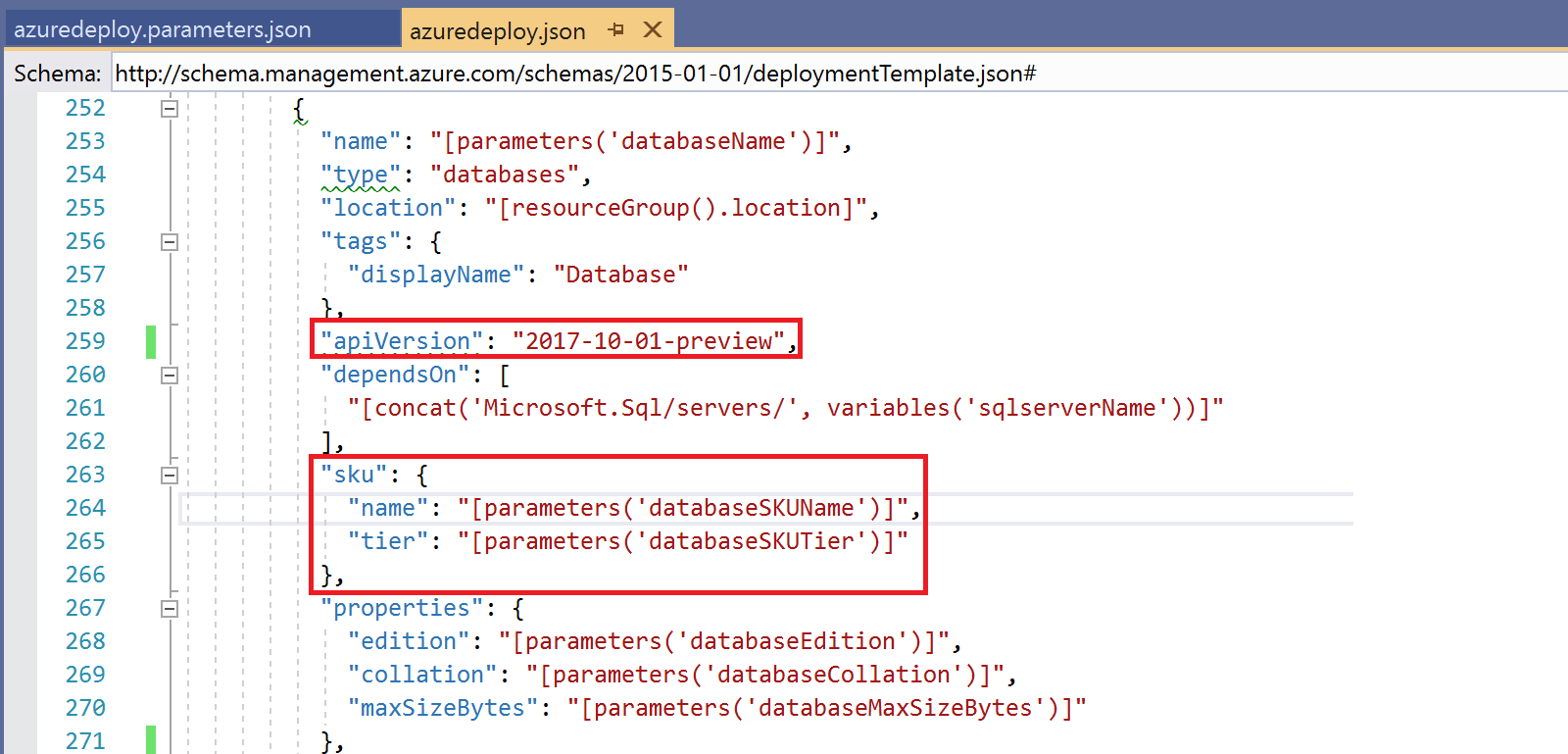 Using this documentation, we set the new “apiVersion” to “2017-10-01-preview”, and setup the new sku area with the new values we have defined in the parameters.