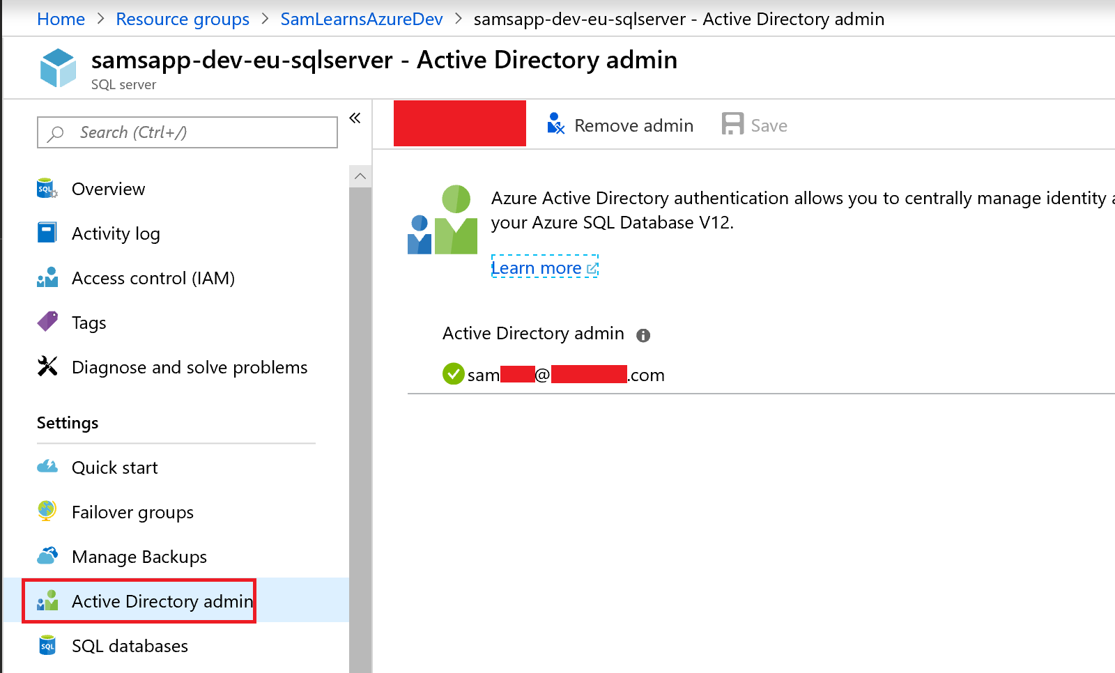To resolve the “Provision an Azure AD Administrator for SQL server” item, we need to browse to the SQL Server and add an AD administrator. First we learn how to complete this task in the portal – browsing to the SQL server and adding the administrator.