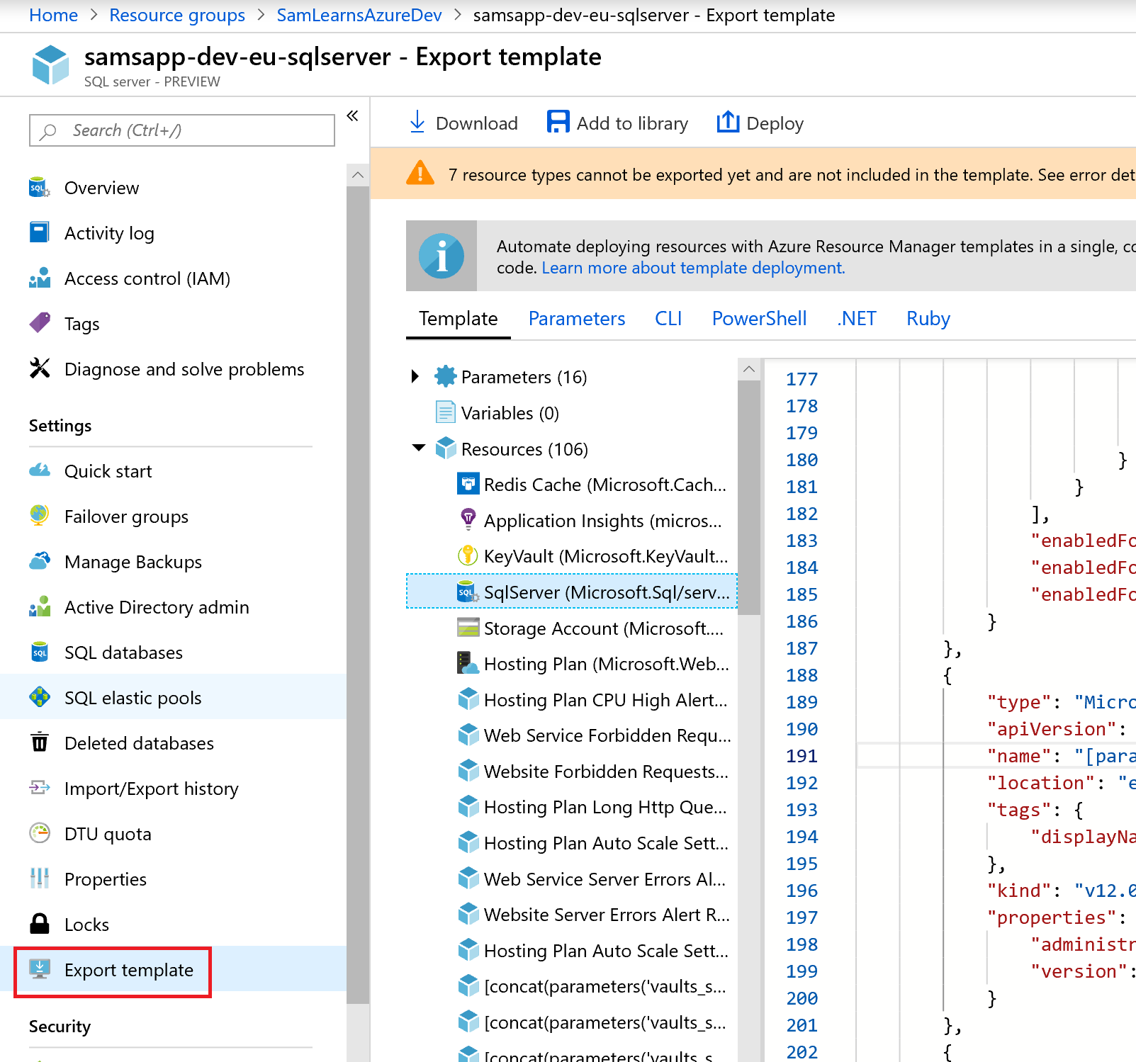 Then we export the resource group. In the resulting ARM template, we can compare what we have to add to use this setting. With that resource, we can then see the change and easily find the right section of the documentation for the ARM template.