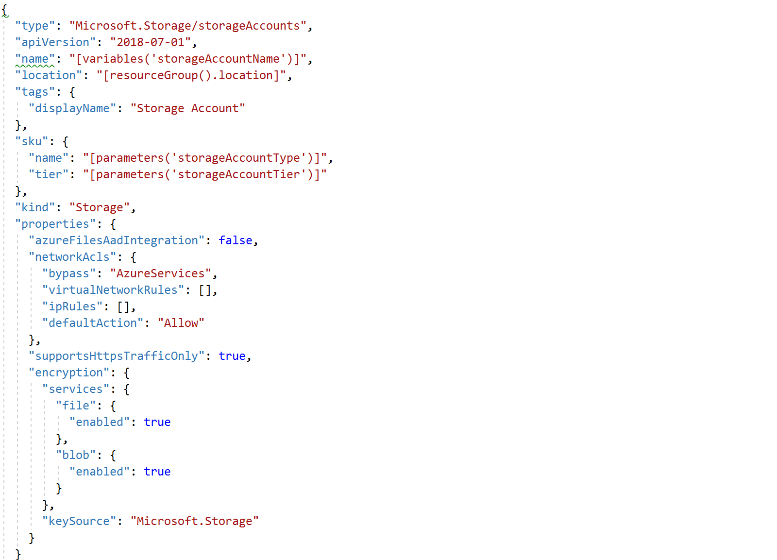 To resolve the “Require secure transfer to storage account” item, need to configure the Azure Storage account to only allow HTTPS. Again, once we’ve made the recommended change to our “Dev” environment and exported the template, we are able to discover the correct documentation to correctly configure our storage account, and update the Azure Storage template below: