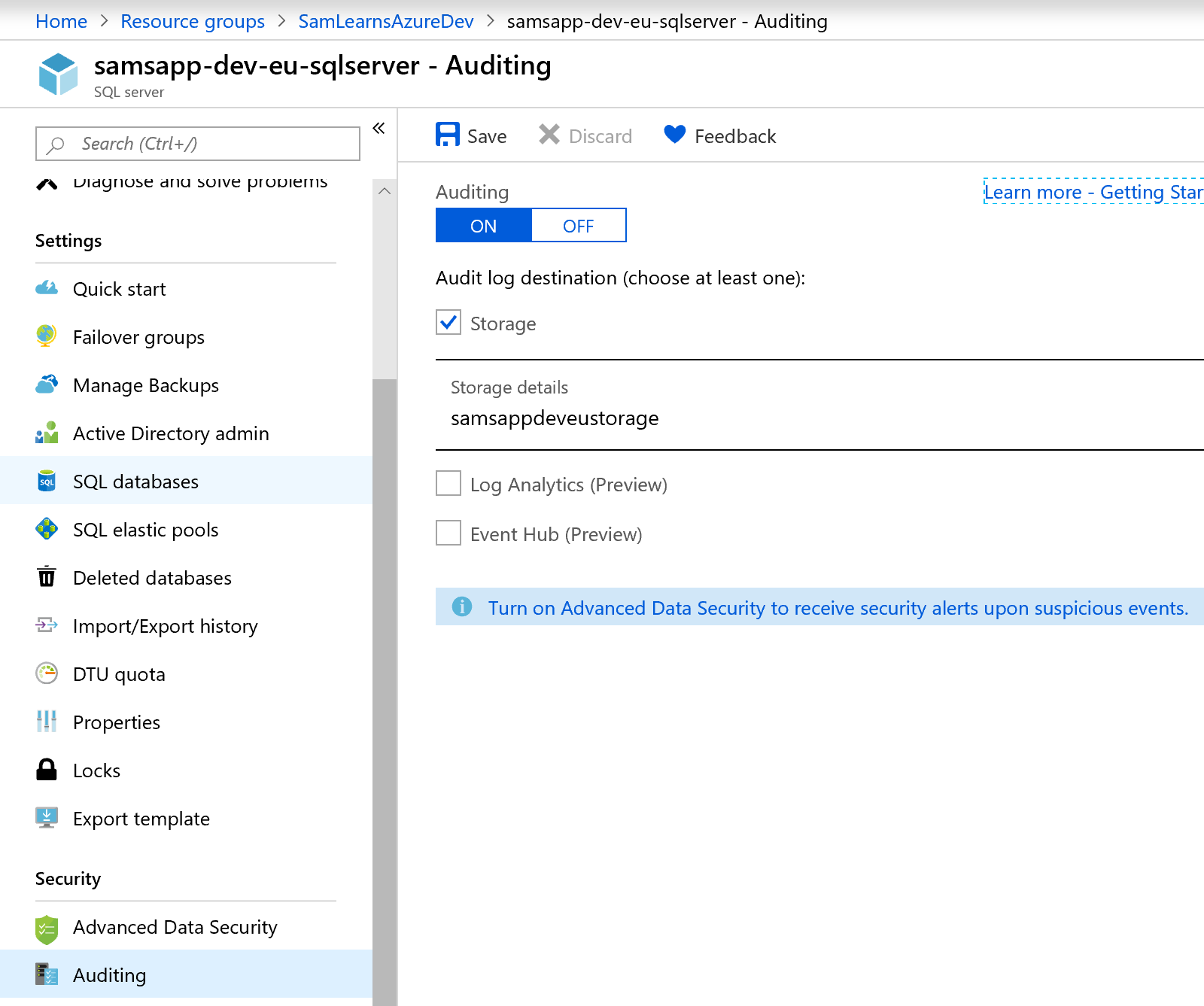 Finally, to resolve the “Enable auditing on SQL Server” item, we need to browse to the SQL server and configure logging to our Azure Storage account.