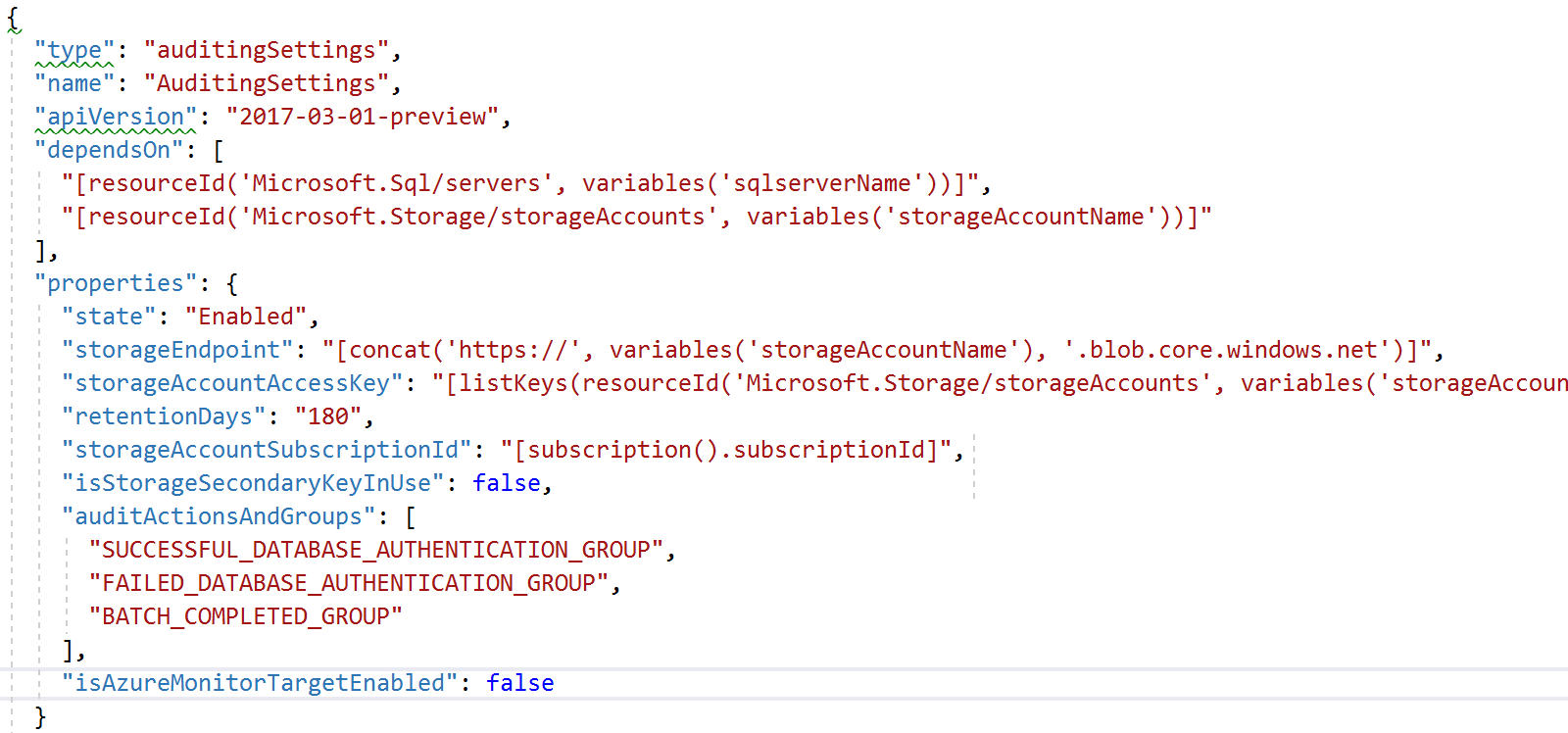The exported ARM template here is complicated, it uses an old API version and requires a template for each database server and each database. Fortunately, there is an updated API version that rolls this together into one resource – this template will apply to the server and each database will inherit these settings. Here in the properties, we enable the auditing, specify the storage blob endpoint, retrieve the storage account access key, set the retention to 180 days, set the storage subscription id, and finally, set the actions and groups we want to audit, using the default settings to audit database successful and failed database authentication, and to audit all queries on our database.