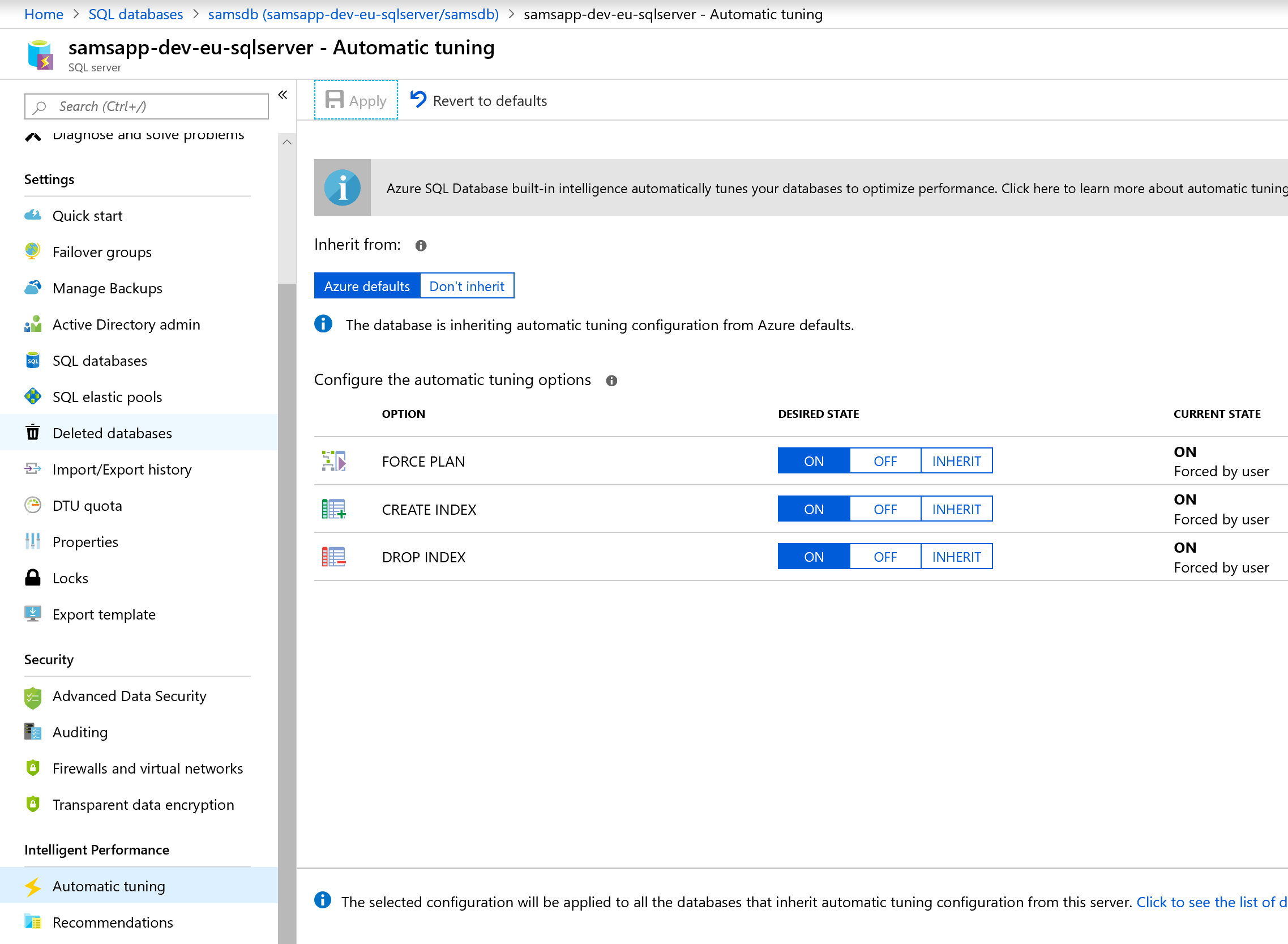 - Enabled SQL auto tuning with ARM templates: https://stackoverflow.com/questions/46497300/enabling-azure-sql-database-automatic-tuning-via-arm