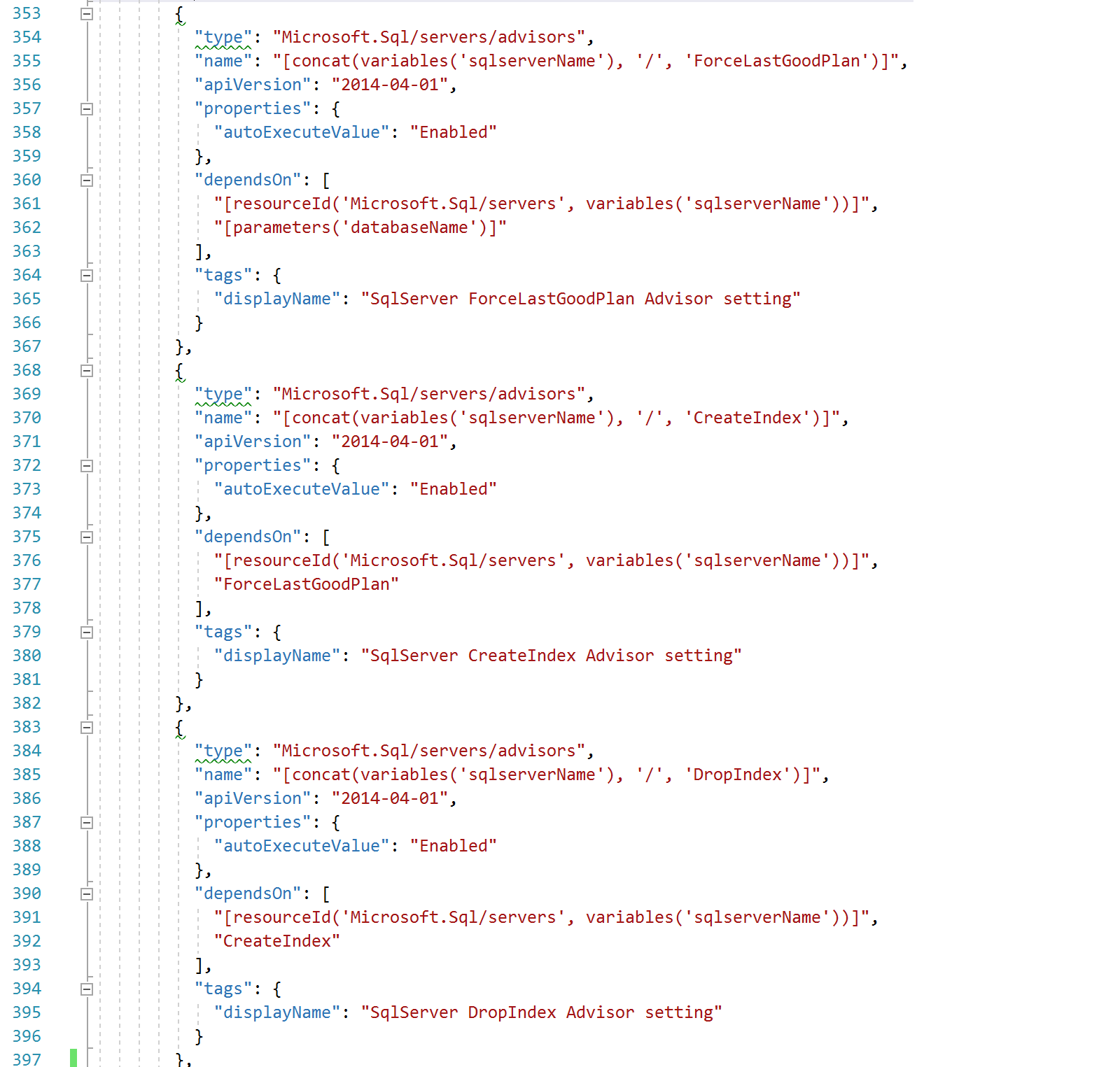 As we want to codify everything and turn it into infrastructure as code, below is the ARM template for our advisors. It’s fairly straight forward, each of the three sections has the advisor type and enables the advisor to run. We set the advisor settings on the server, and the databases will inherit the settings. It’s also possible to override settings on specific databases, but we don’t need that today.