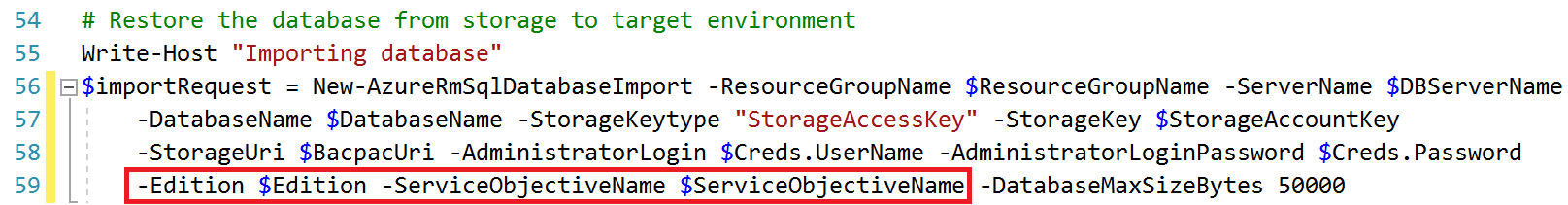 We commit our code and push it and note that after the deployment, that our dev and QA databases are still being set to the database SKU of “S1”. After further investigation, we discover that in our ImportBacPac PowerShell script, we specify the database SKU as part of the import, so we correct this to import the database as a “Basic” type, adding these items as parameters to the script and specifying the databases size as part of the deployment.