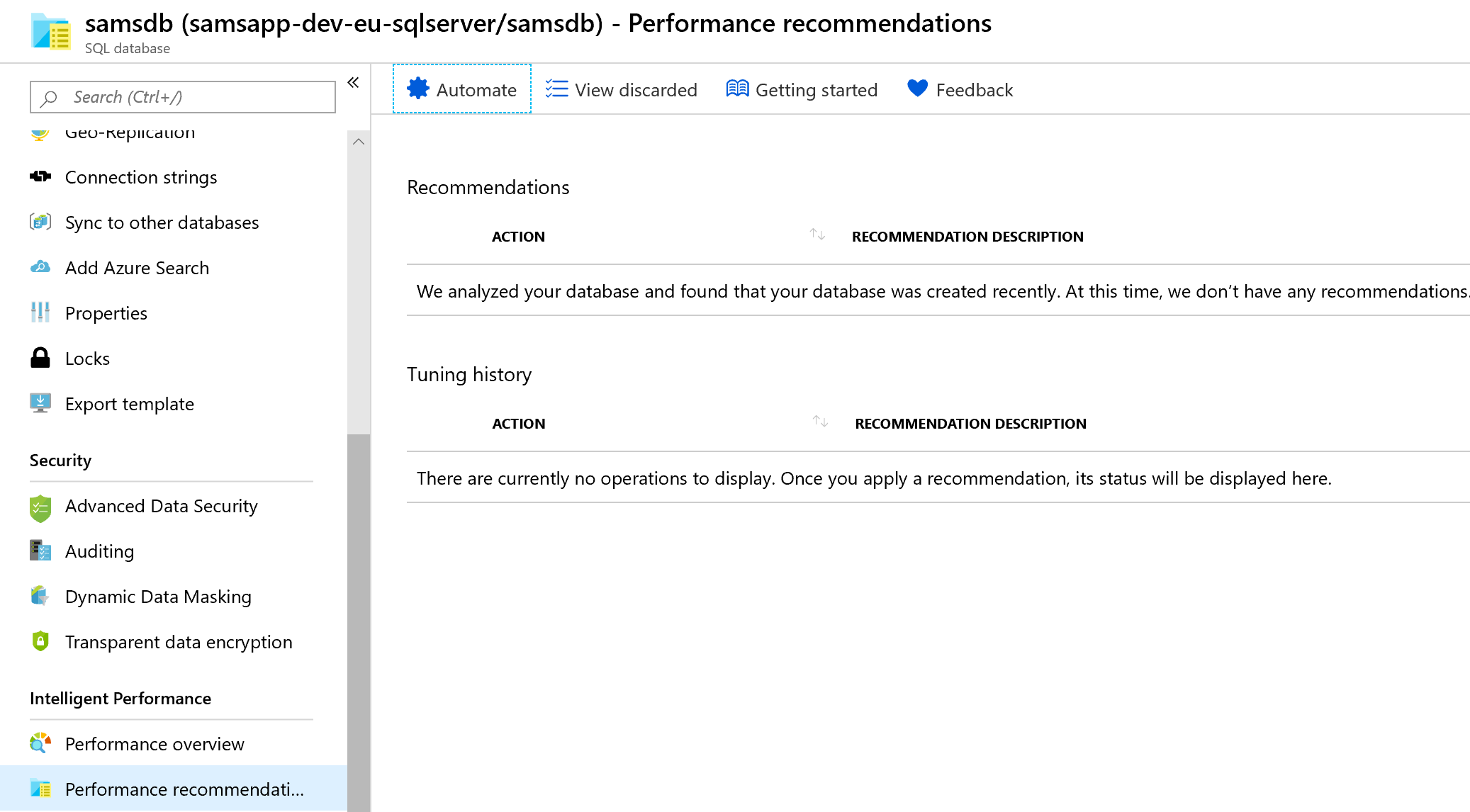 In our database, we can now browse to the “Performance recommendations”, and see our recommendations – we don’t have any today, but we will continue to monitor this.