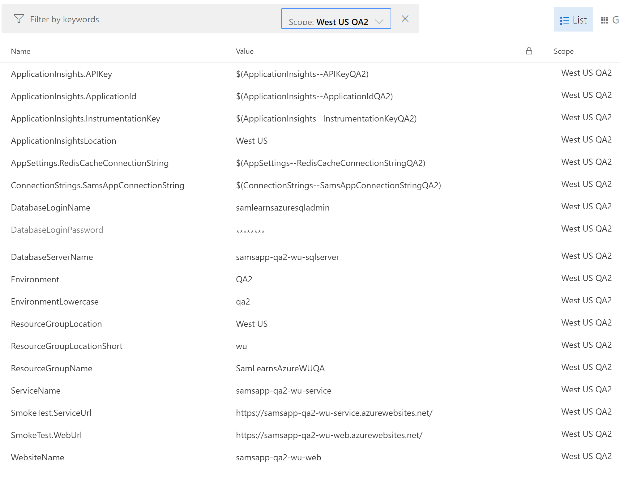 If we look closer at the variables required for West US, we still have a few variables coming from Key vault – but now our script populates key vault for us as we deploy – while they will not be available before the release, they will be generated after the deployment of the ARM template resources, just-in-time. Then we name some of our resources, using our format (“wu” for “West US”). We also set the resource group name, and a few functions need full resource group locations, where you can see “West US”.
