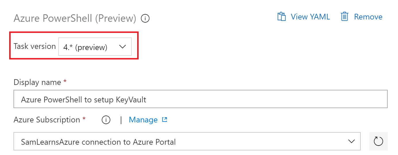 You may have also noticed that there are two main types of Azure PowerShell – functions with RM in the name, and functions with AZ in the name. AZ is the newer version, and will eventually replace the RM functions. To use AZ, you need to use “4.*” version in the Azure PowerShell task in Azure DevOps. It is recommended that as you write new PowerShell scripts, you avoid the RM commands and use AZ commands.