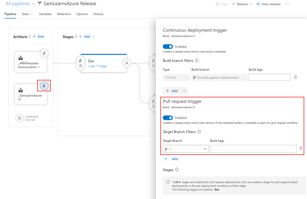 We also want to expand on our pull requests to be able to deploy our code. Eventually we want to create a dynamic environment and then tear it down, but for now, we will just piggy back on our “Dev” environment. We have the option to deploy every pull request, or just individual branches. We can do this in the “Continuous deployment trigger” page in the release. We do have to specify a branch, but in the screenshot below we can use “*” to deploy all Pull Requests. However, this can be dangerous – make sure you ask the question “do you really want to deploy everything on every commit?”