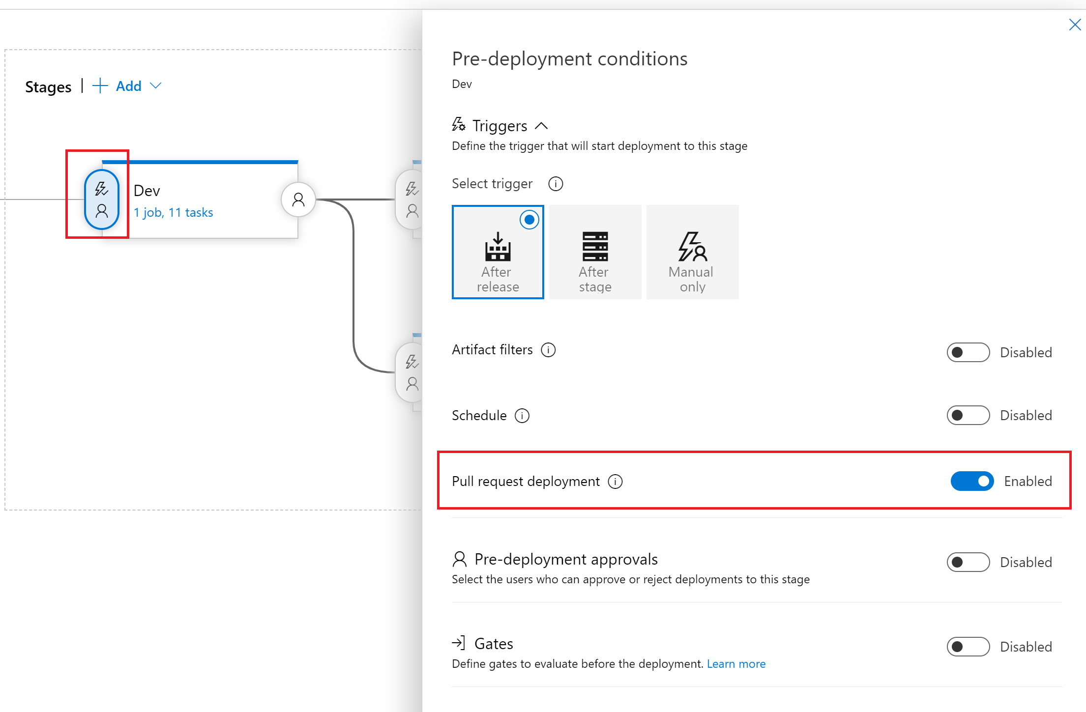 The last step is to specify which of the environments will deploy on a pull request – we definitely don’t want updates going to production. For this example, we only enable “Dev”, by browsing to the environment and enabling the “Pull request deployment” switch – this is off on all environments by default.